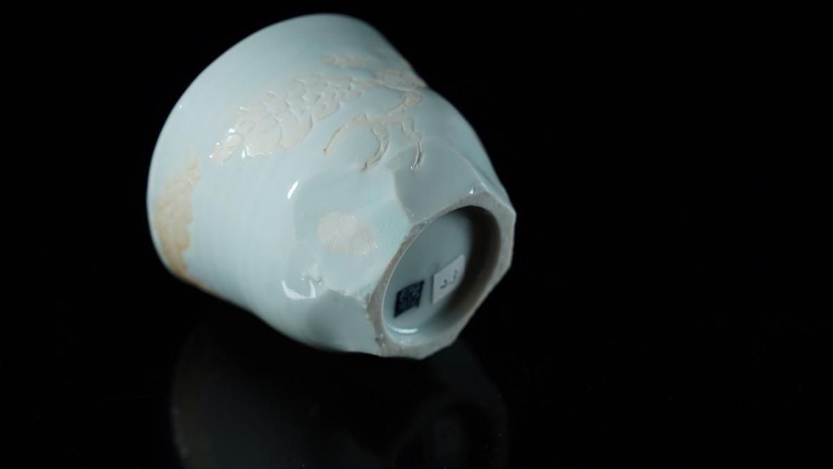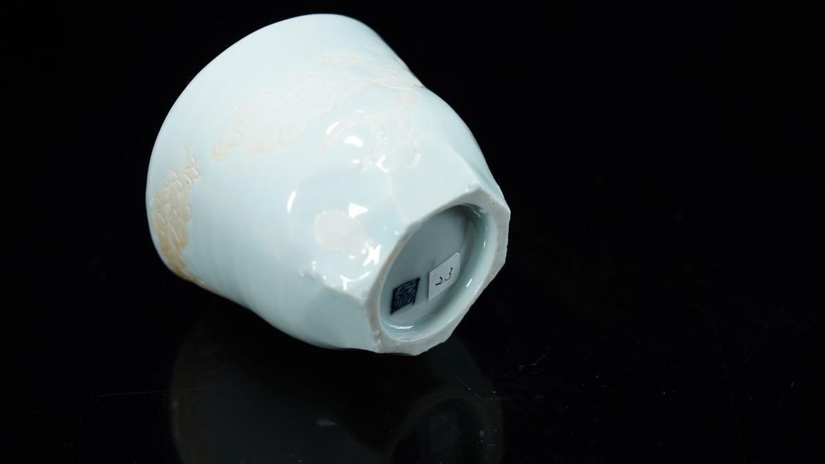 ÎëÌÚÎÃ»Ò ¹ï²ÖÀ÷ÉÕÏ»³ÑÇÖ [ Blue-and-White Hexagonal Sake Cup with Carved Floral Design by Ryoko Suzuki ]