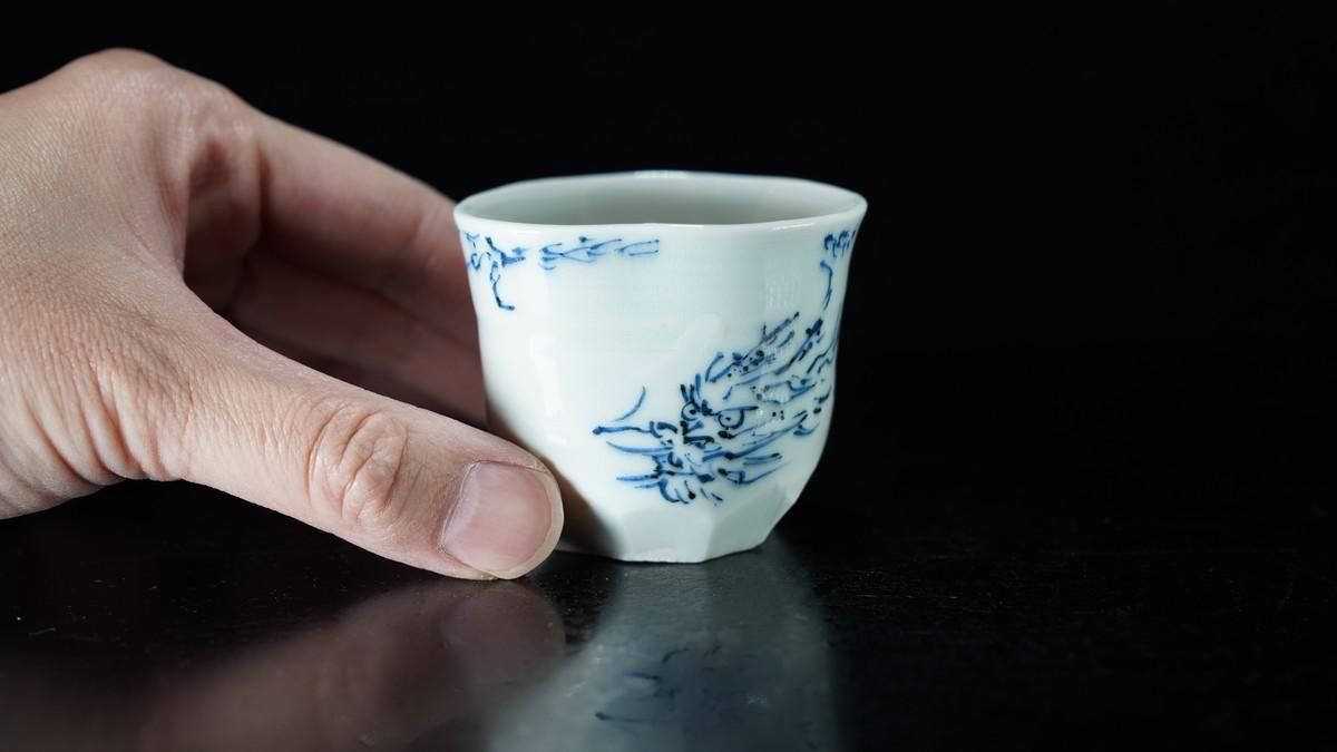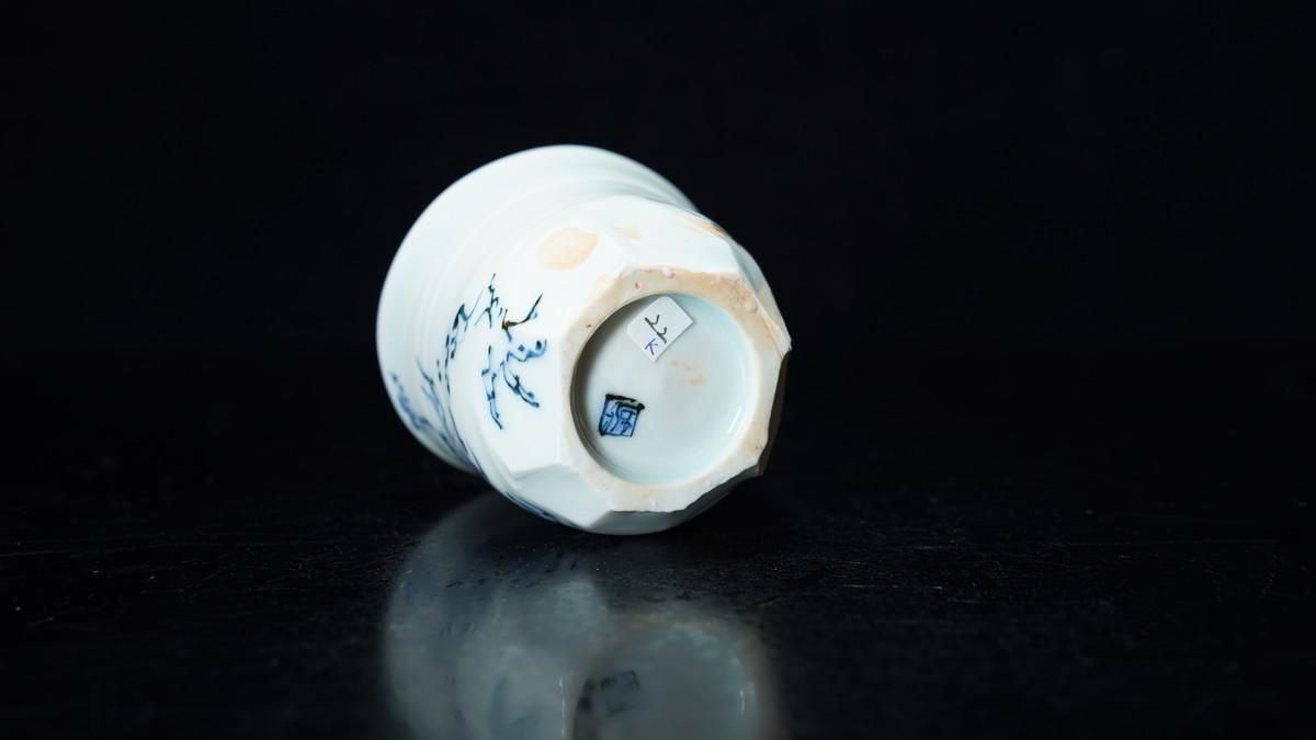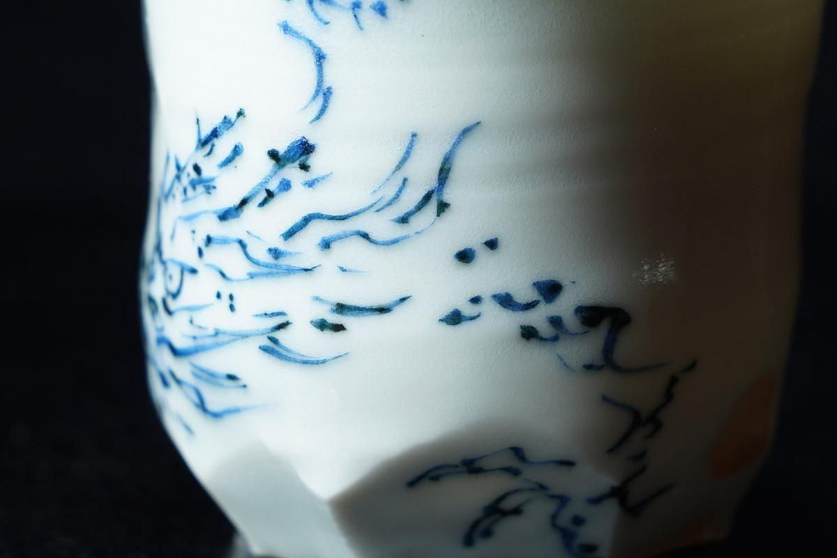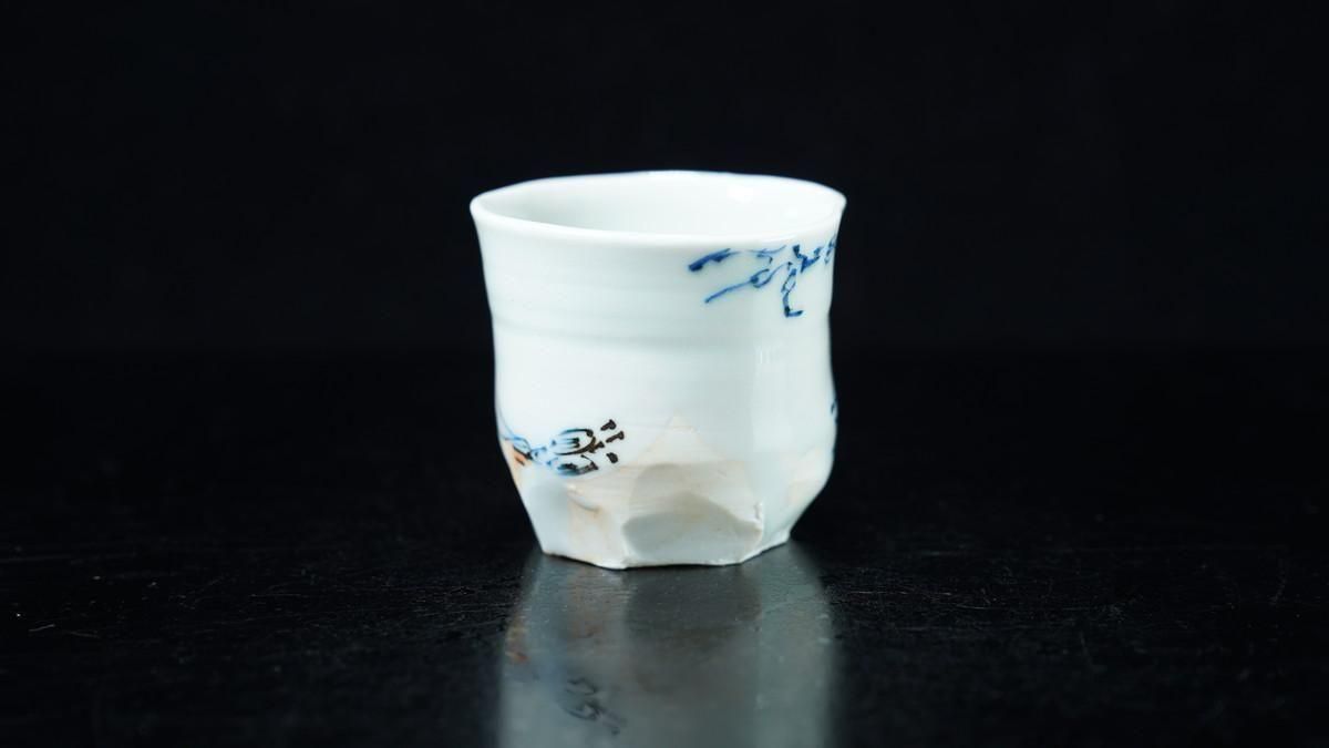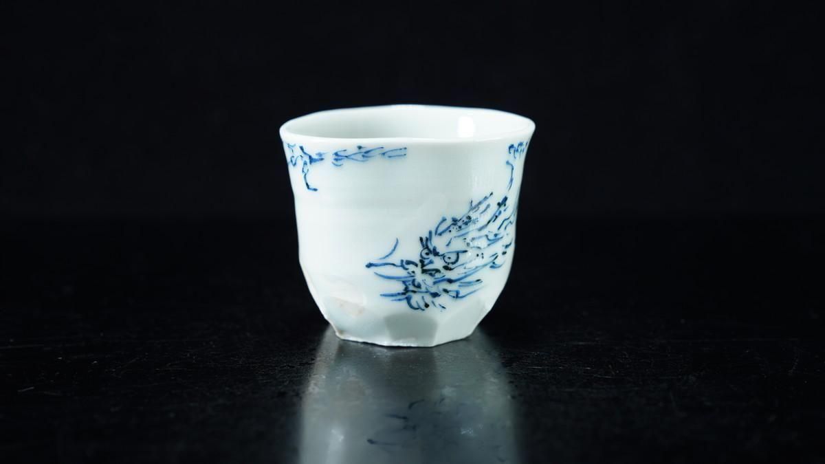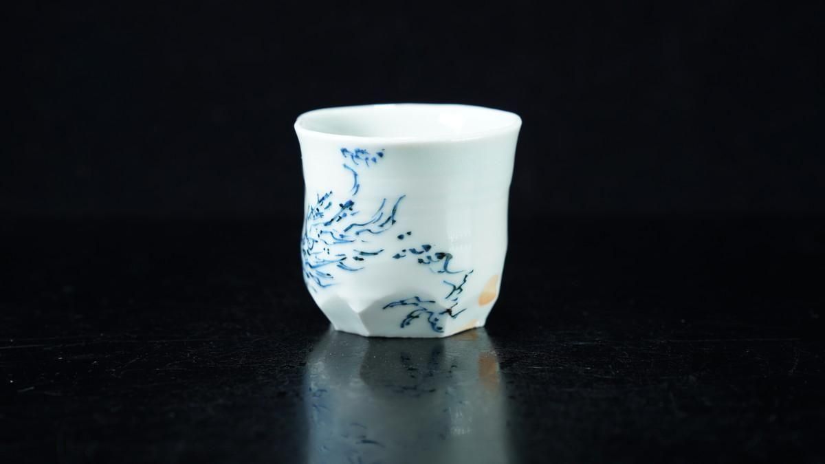 ÎëÌÚÎÃ»Ò ¹ï²ÖÀ÷ÉÕÏ»³ÑÇÖ [ Blue-and-White Hexagonal Sake Cup with Carved Floral Design by Ryoko Suzuki ]