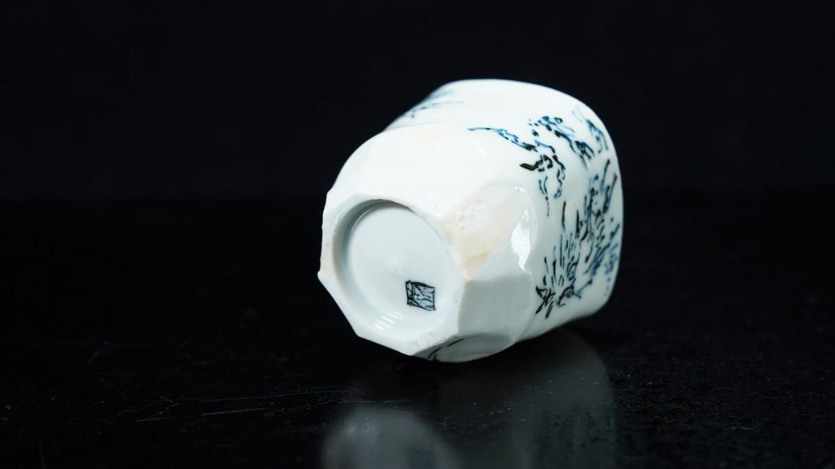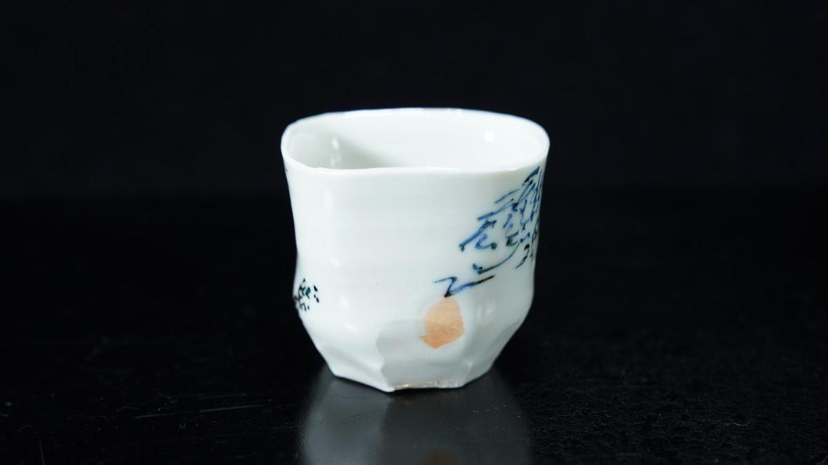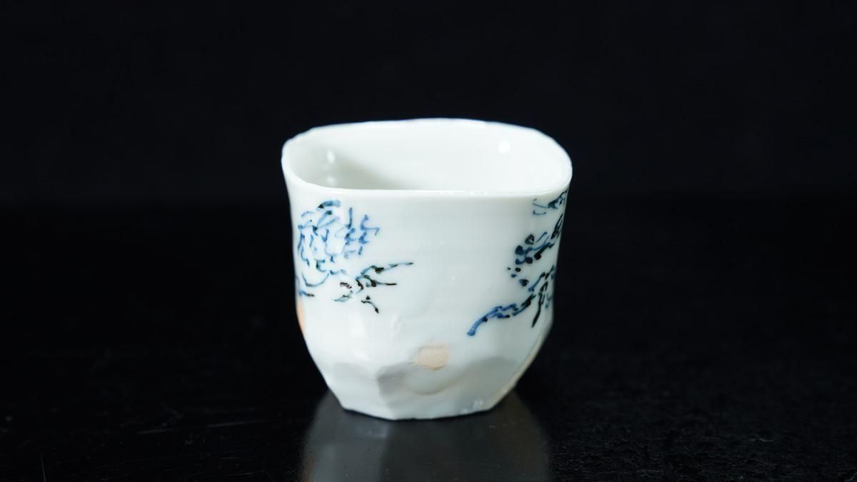 ÎëÌÚÎÃ»Ò ¹ï²ÖÀ÷ÉÕÏ»³ÑÇÖ [ Blue-and-White Hexagonal Sake Cup with Carved Floral Design by Ryoko Suzuki ]