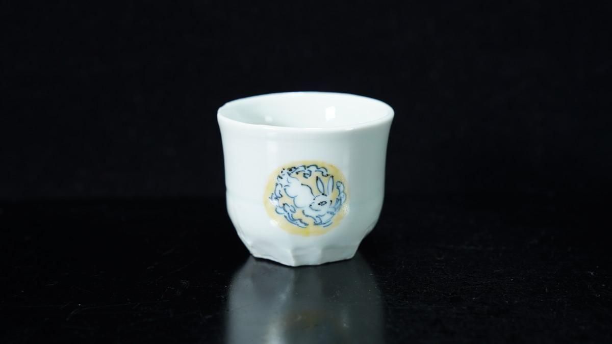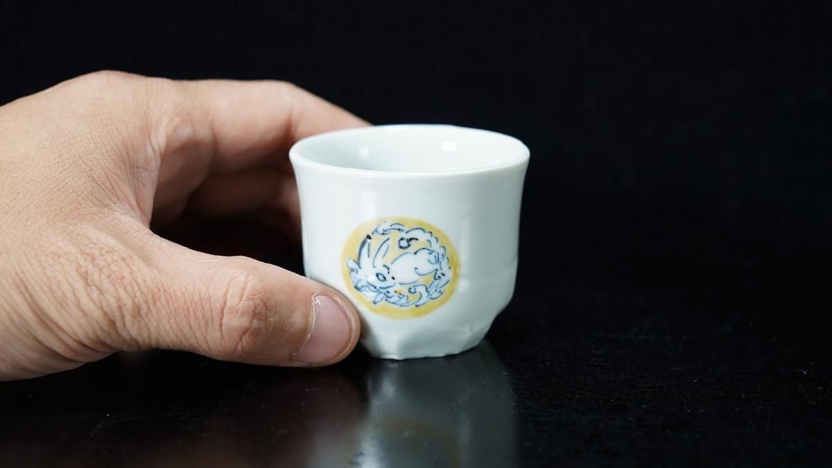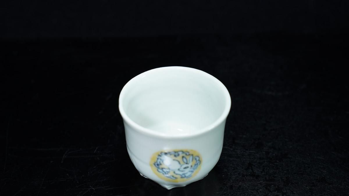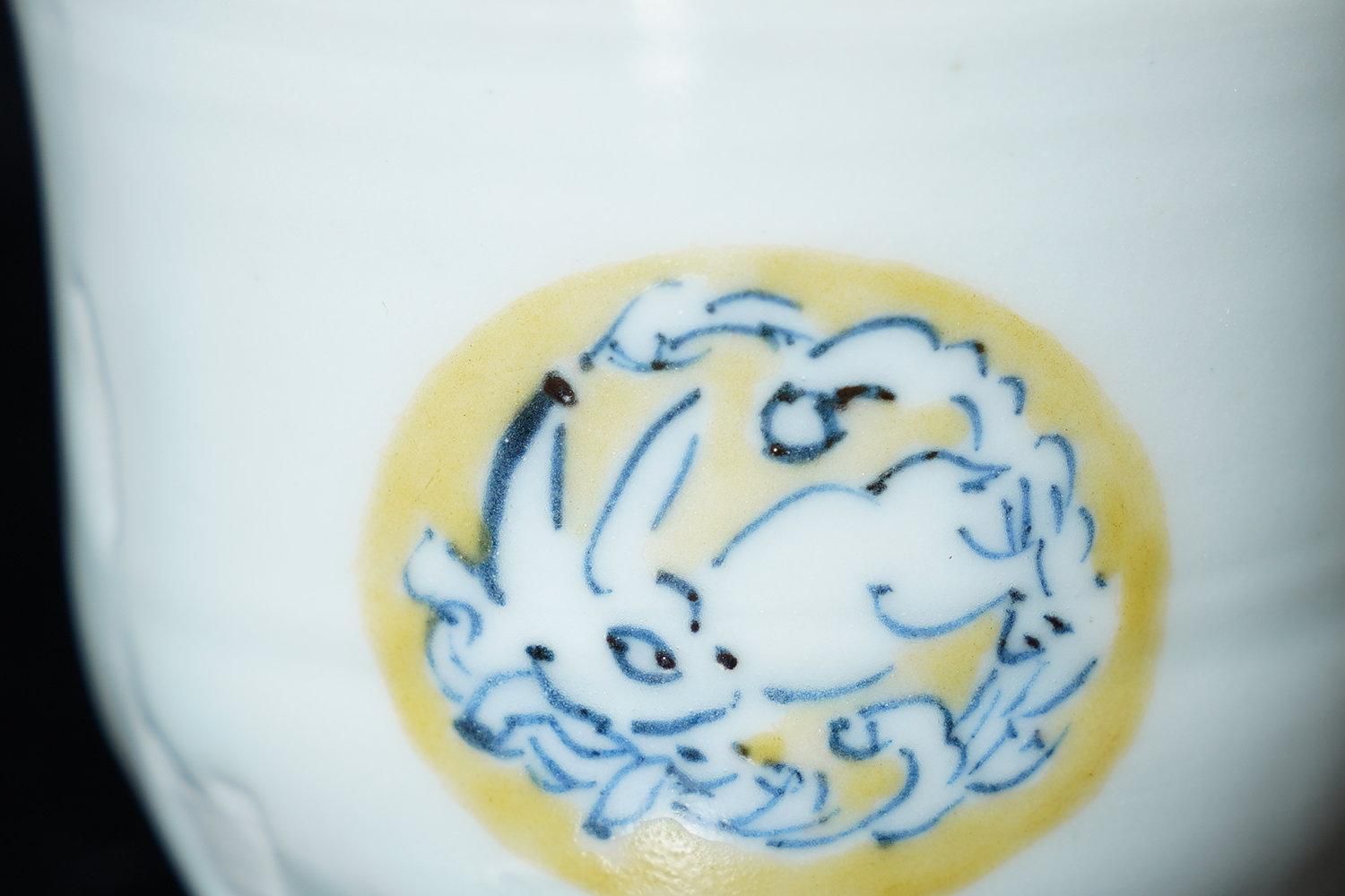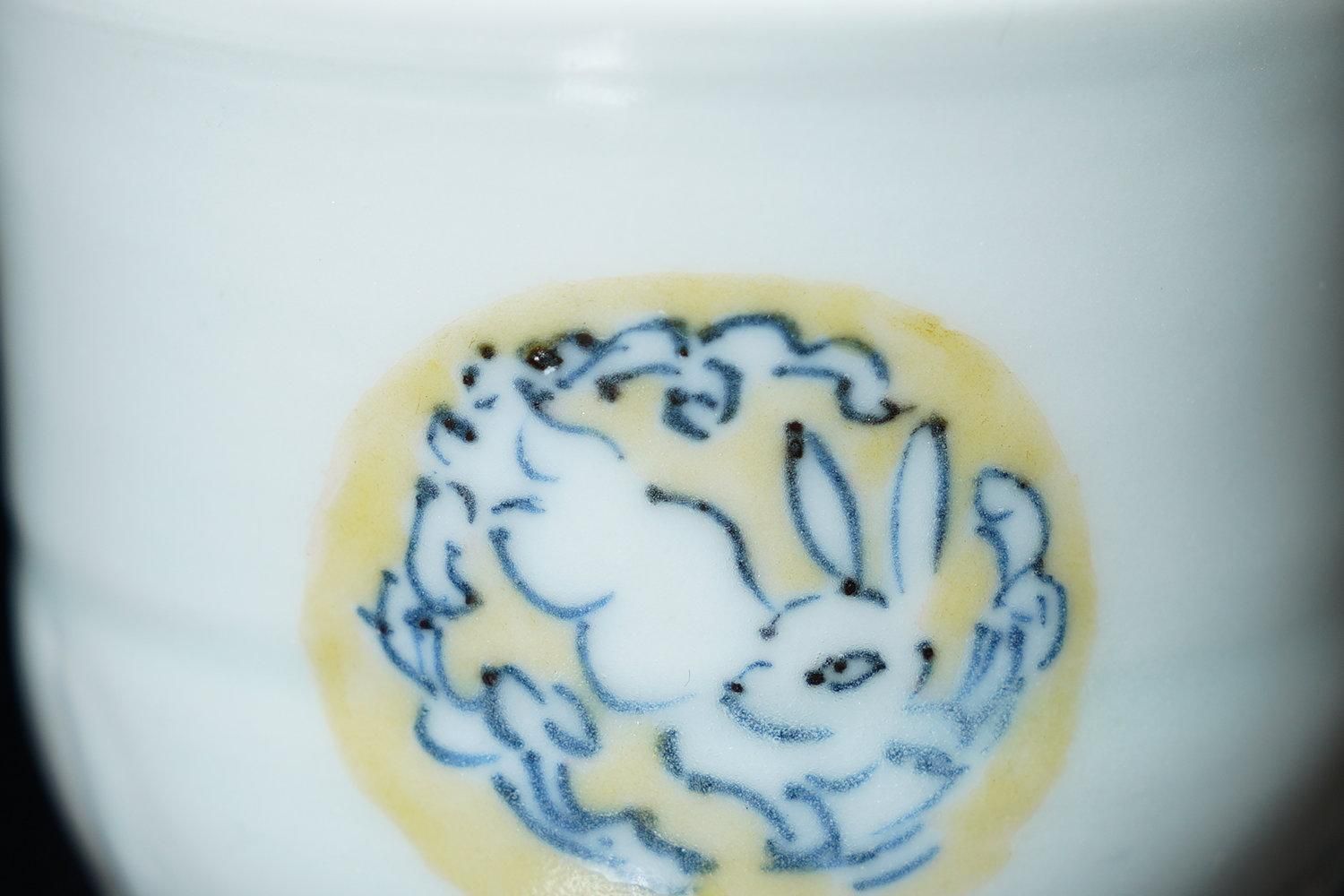 ÎëÌÚÎÃ»Ò ÀIJֲ«ºÌÇÈÅÆÊ¸ÇÖ [ Blue and White Sake Cup with Yellow-glazed Wave and Rabbit Design by Ryoko Suzuki ]
