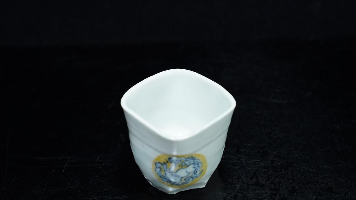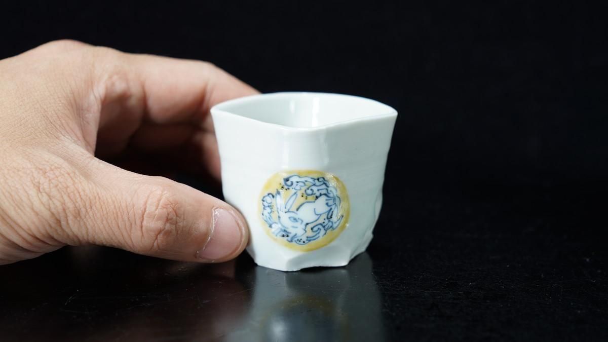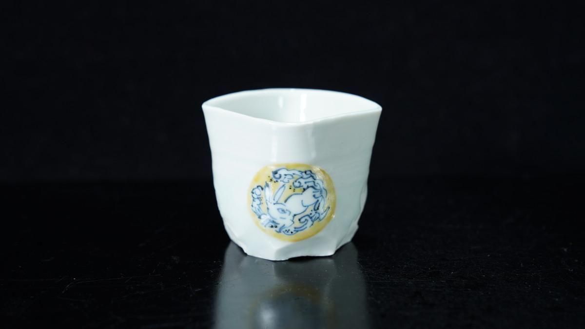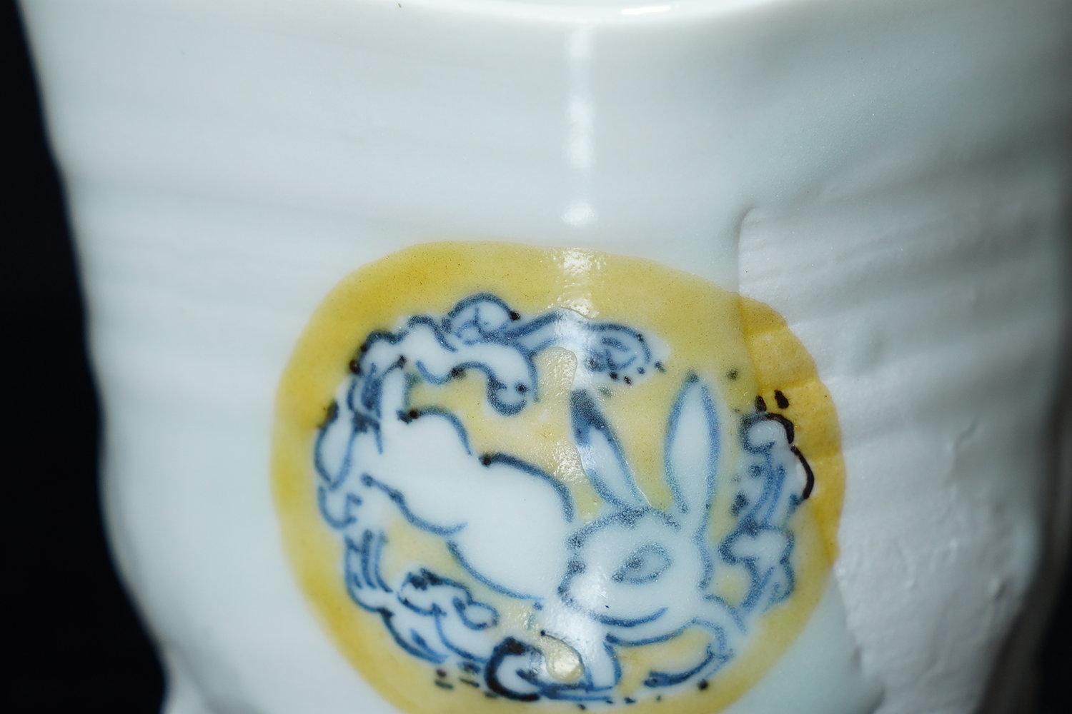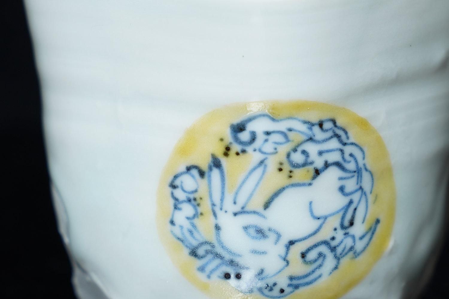 ÎëÌÚÎÃ»Ò ÀIJֲ«ºÌÇÈÅÆÊ¸ÇÖ [ Blue and White Sake Cup with Yellow-glazed Wave and Rabbit Design by Ryoko Suzuki ]