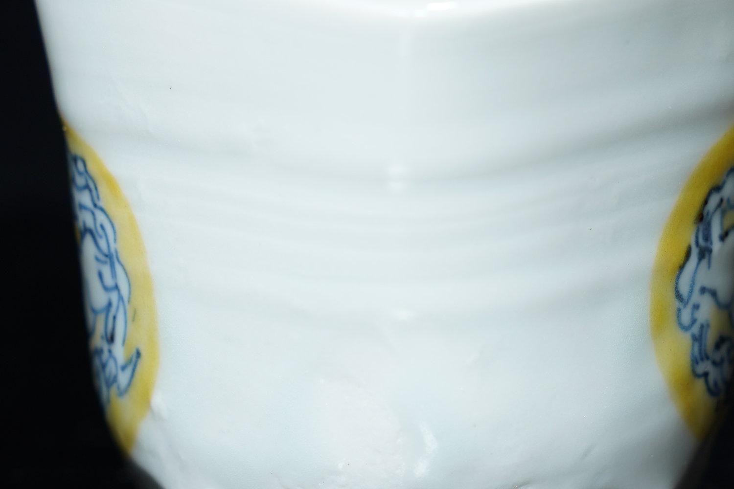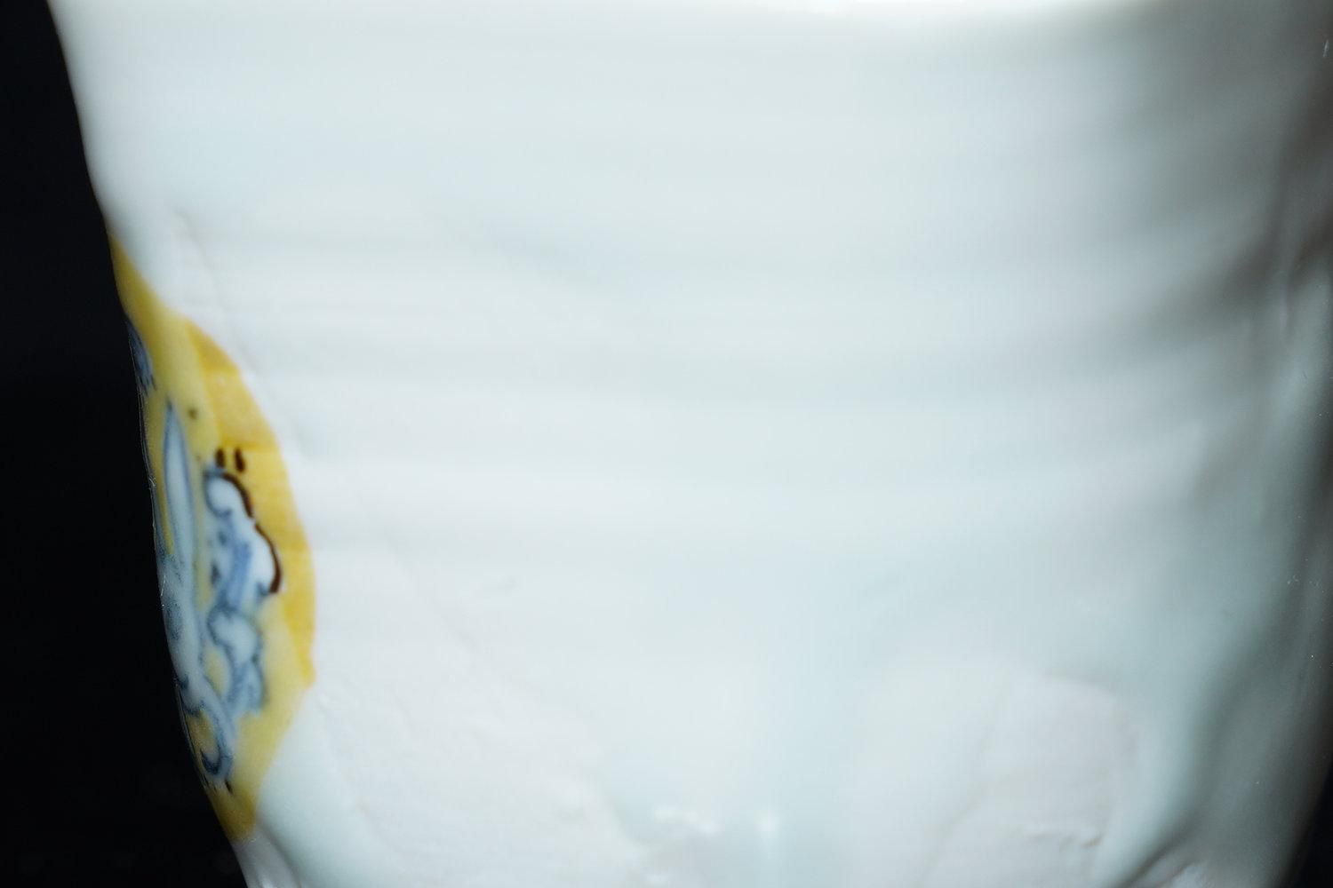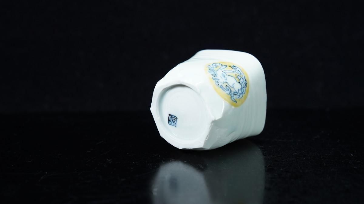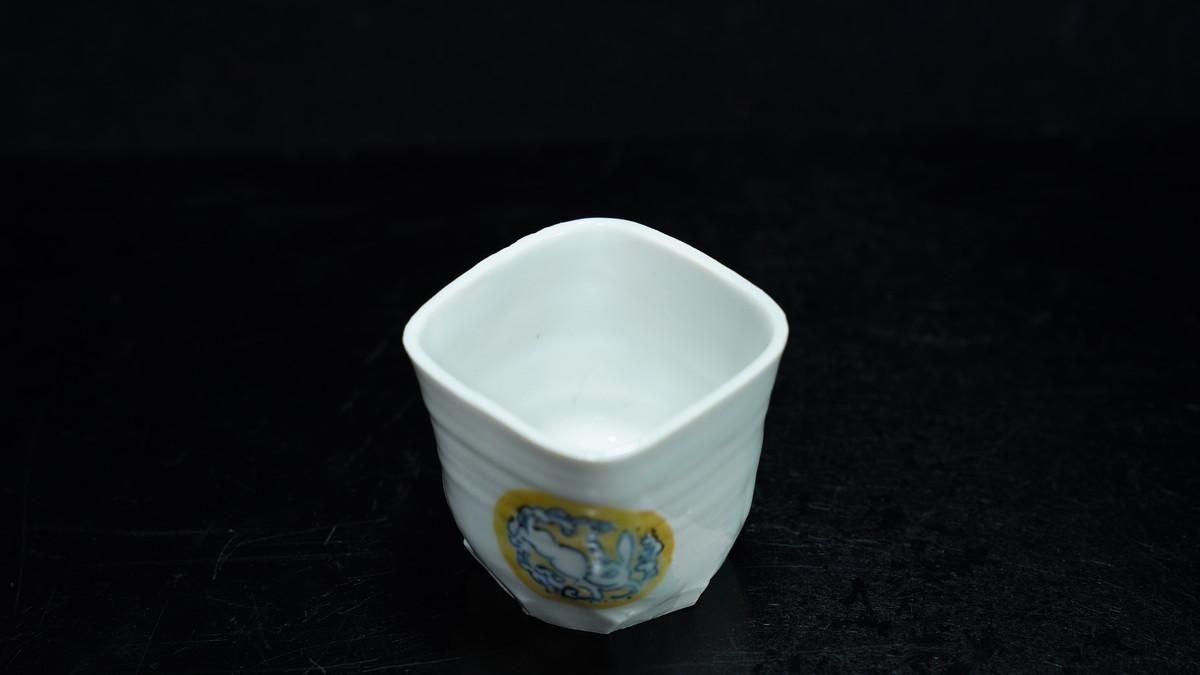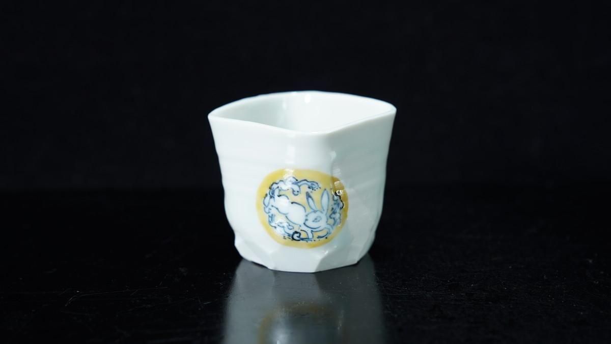ÎëÌÚÎÃ»Ò ÀIJֲ«ºÌÇÈÅÆÊ¸ÇÖ [ Blue and White Sake Cup with Yellow-glazed Wave and Rabbit Design by Ryoko Suzuki ]