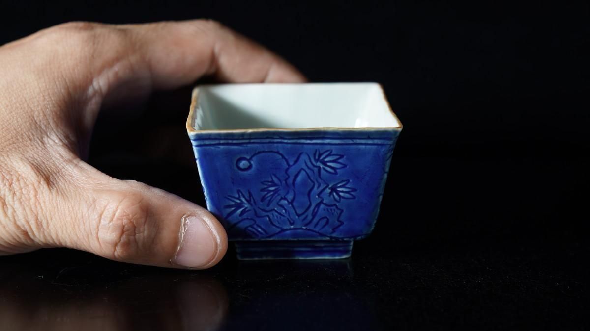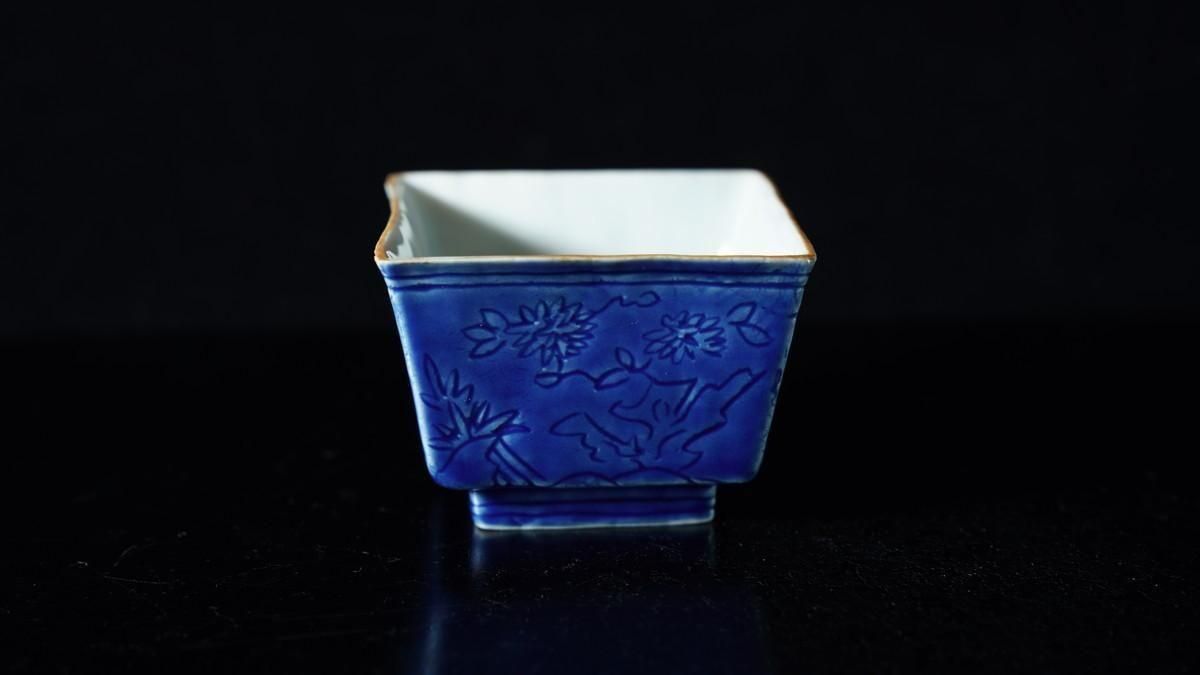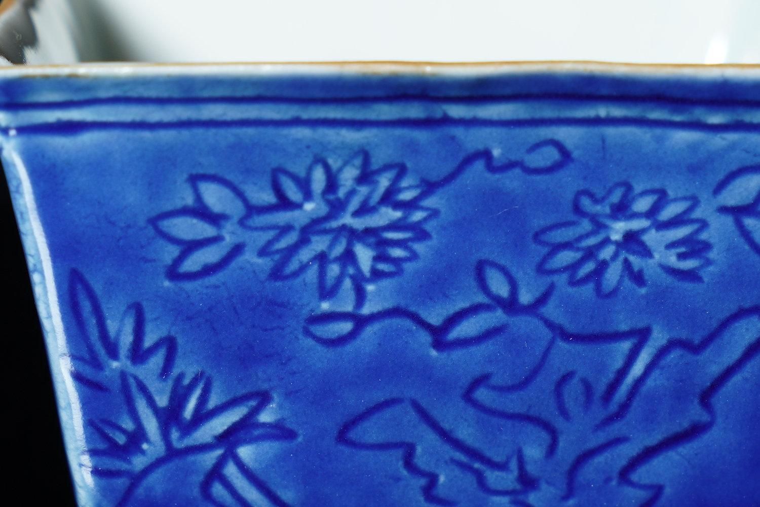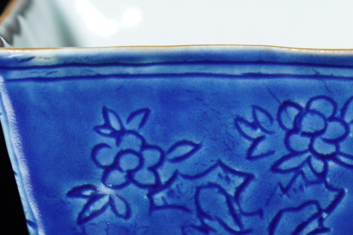 ÎëÌÚÎÃ»Ò ¹ï²ÖÀ÷ÉÕÏ»³ÑÇÖ [ Blue-and-White Hexagonal Sake Cup with Carved Floral Design by Ryoko Suzuki ]
