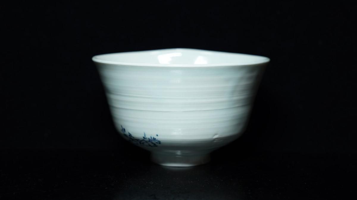 ÎëÌÚÎÃ»Ò ¹ï²ÖÀ÷ÉÕÏ»³ÑÇÖ [ Blue-and-White Hexagonal Sake Cup with Carved Floral Design by Ryoko Suzuki ]